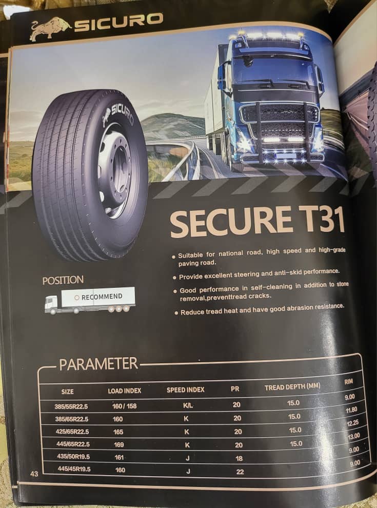 سایز ۳۸۵/۶۵R22.5 با وزن ۷۳ کیلوگرم و شاخص بار ۵۰۰۰ کیلو گرم برای هر تایر و گارانتی ۵ ساله